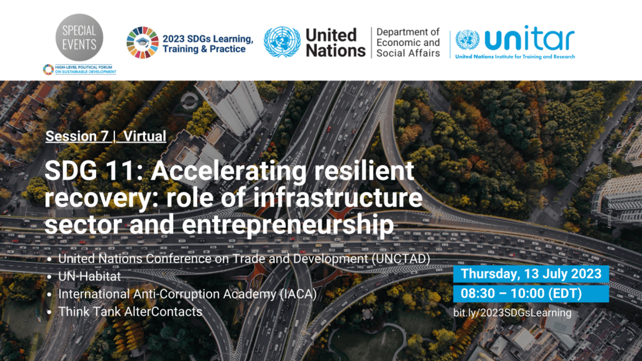 Focused on SDG 11 (Sustainable cities and communities) and SDG 17 (Partnership for the goals), this virtual session explored pathways for resilient post COVID-19 recovery by leveraging the SDG Cities Global Initiative, transparent infrastructure development, and urban entrepreneurship. Through interactive discussions, digital tools introduction, presentation of corruption prevention tools, and sharing insights on urban expansion, the session aimed to promote institutional synergies for implementing the 2030 Agenda by addressing sustainable city acceleration, corruption risks in infrastructure, urban entrepreneurs' role in innovation, and lessons from pandemic-resilient entrepreneurs.